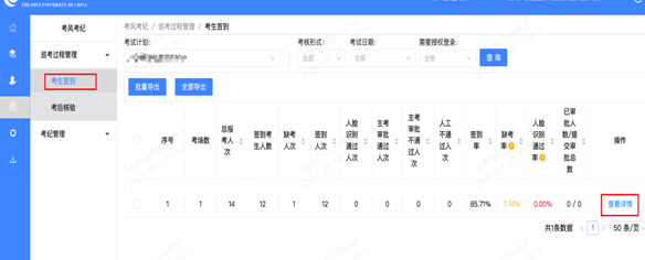 步骤一:考试管理系统,主考/考点管理员进入到“【考风考纪】-【巡考过程管理】-【考生签到】”页面,找到对应考试,点击“查看详情”按钮。