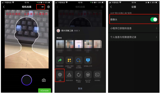 答:小程序拍照是需要获取手机的拍照权限的,如果当小程序提示是否允许获取权限时选择了否,此时小程序使用不了手机的摄像头功能,就会呈现黑色,此时可以点击【右上角的3个点】,在打开的页面中点击【设置】,再设置页面中把摄像头的权限打开即可。