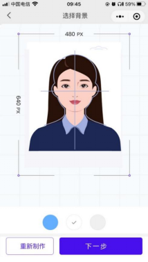 制作成功后会进入“选择背景”的页面中,在此页面中会看到制作成功的照片,默认是蓝色背景,学生也可视衣服情况更改背景颜色,系统会自动进行处理目的是让背景和衣服形成较大反差,以便更好的通过学信网检测;