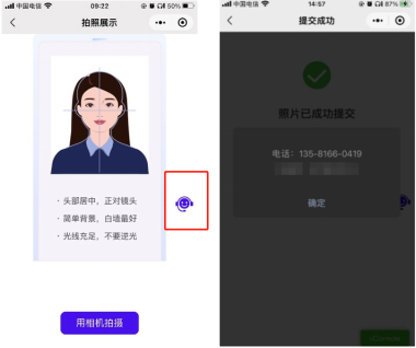 点击【下一步】会校验所填信息的真伪,出结果后会进入 “照片校验”页面。点击【确认无误并提交】,可进入“提交成功”页面。